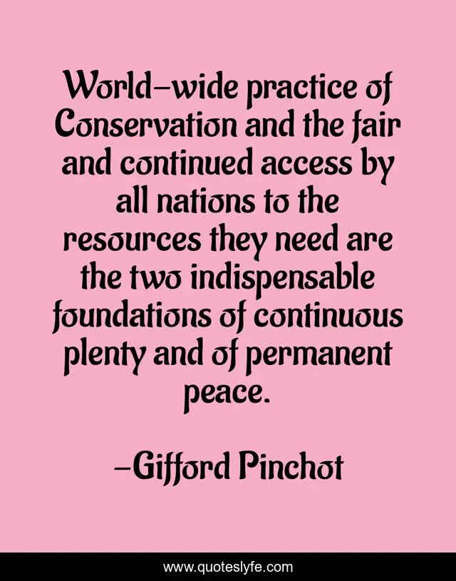 This page presents the quote "World-wide practice of Conservation and the fair and continued access by all nations to the resources they need are the two indispensable foundations of continuous plenty and of permanent peace.". Author of this quote is Gifford Pinchot. This quote is about practice, resources,.