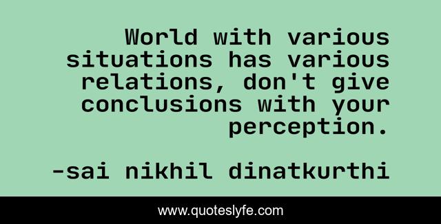 This page presents the quote "World with various situations has various relations, don't give conclusions with your perception.". Author of this quote is sai nikhil dinatkurthi. This quote is about truth-of-life, phylosiphical, life-lessons, perception, hope,.
