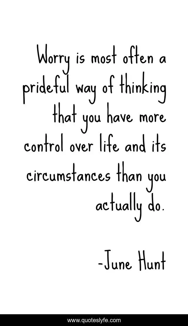This page presents the quote "Worry is most often a prideful way of thinking that you have more control over life and its circumstances than you actually do.". Author of this quote is June Hunt. This quote is about life, worry, circumstances,.