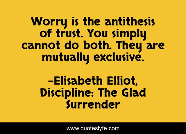 This page presents the quote "Worry is the antithesis of trust. You simply cannot do both. They are mutually exclusive.". Author of this quote is Elisabeth Elliot, Discipline: The Glad Surrender. This quote is about faith, trust, worry, opposites,.