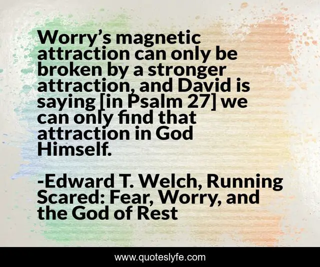 This page presents the quote "Worry’s magnetic attraction can only be broken by a stronger attraction, and David is saying [in Psalm 27] we can only find that attraction in God Himself.". Author of this quote is Edward T. Welch, Running Scared: Fear, Worry, and the God of Rest. .