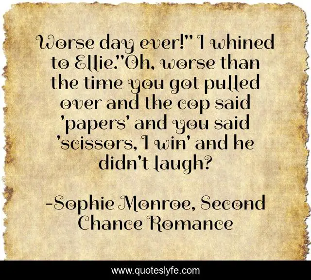 This page presents the quote "Worse day ever!" I whined to Ellie."Oh, worse than the time you got pulled over and the cop said 'papers' and you said 'scissors, I win' and he didn't laugh?". Author of this quote is Sophie Monroe, Second Chance Romance. .