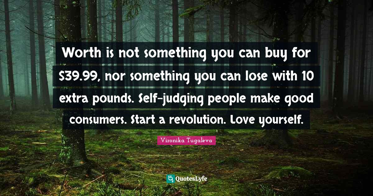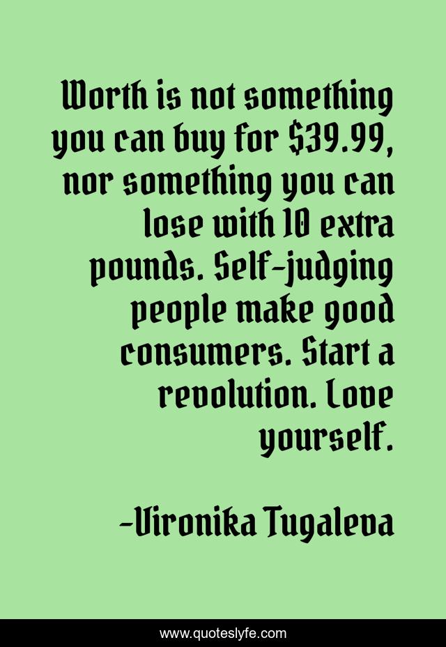 This page presents the quote "Worth is not something you can buy for $39.99, nor something you can lose with 10 extra pounds. Self-judging people make good consumers. Start a revolution. Love yourself.". Author of this quote is Vironika Tugaleva. This quote is about consumerism, self-respect, self-confidence, self-love, revolution, self-esteem, consumer, materialism,.
