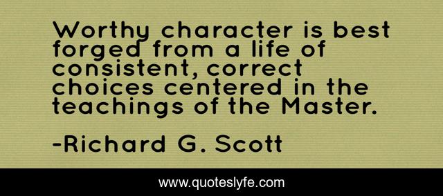 This page presents the quote "Worthy character is best forged from a life of consistent, correct choices centered in the teachings of the Master.". Author of this quote is Richard G. Scott. This quote is about god, character,.