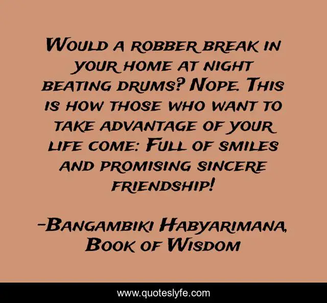 This page presents the quote "Would a robber break in your home at night beating drums? Nope. This is how those who want to take advantage of your life come: Full of smiles and promising sincere friendship!". Author of this quote is Bangambiki Habyarimana, Book of Wisdom. This quote is about beware-of-unfriendly-friends, friends, bad-friendship, bad-friends, friendship, friend,.