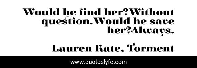 This page presents the quote "Would he find her?Without question.Would he save her?Always.". Author of this quote is Lauren Kate, Torment. This quote is about love, affection,.