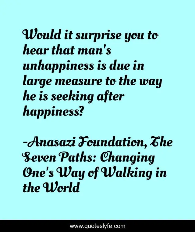 This page presents the quote "Would it surprise you to hear that man's unhappiness is due in large measure to the way he is seeking after happiness?". Author of this quote is Anasazi Foundation, The Seven Paths: Changing One's Way of Walking in the World. This quote is about anasazi-foundation, mother-earth, nature, native-american, wisdom, healing, native-american-wisdom, anasazi,.