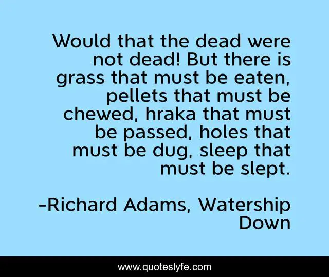 This page presents the quote "Would that the dead were not dead! But there is grass that must be eaten, pellets that must be chewed, hraka that must be passed, holes that must be dug, sleep that must be slept.". Author of this quote is Richard Adams, Watership Down. .