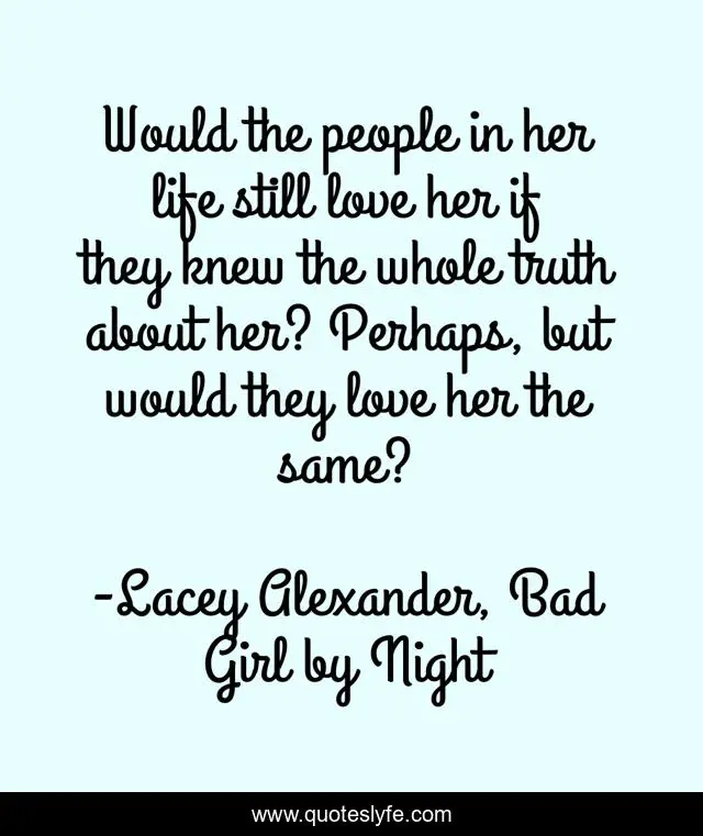 This page presents the quote "Would the people in her life still love her if they knew the whole truth about her? Perhaps, but would they love her the same?". Author of this quote is Lacey Alexander, Bad Girl by Night. This quote is about acceptance, love, affection,.