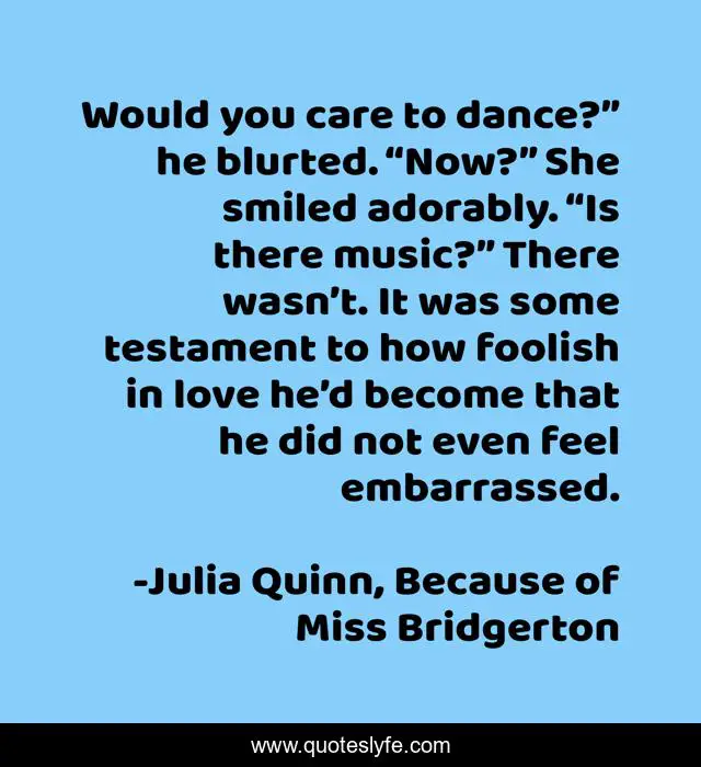 This page presents the quote "Would you care to dance?” he blurted. “Now?” She smiled adorably. “Is there music?” There wasn’t. It was some testament to how foolish in love he’d become that he did not even feel embarrassed.". Author of this quote is Julia Quinn, Because of Miss Bridgerton. This quote is about love, dance, embarrassed, music, foolish, affection,.