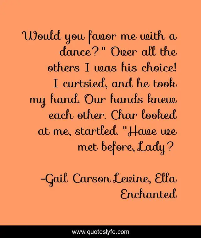 This page presents the quote "Would you favor me with a dance?" Over all the others I was his choice! I curtsied, and he took my hand. Our hands knew each other. Char looked at me, startled. "Have we met before, Lady?". Author of this quote is Gail Carson Levine, Ella Enchanted. This quote is about romance, charm,.