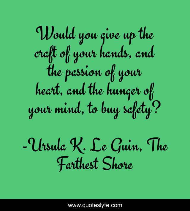 This page presents the quote "Would you give up the craft of your hands, and the passion of your heart, and the hunger of your mind, to buy safety?". Author of this quote is Ursula K. Le Guin, The Farthest Shore. This quote is about fantasy, passions, ambition-and-attitude, safety, fantasy-fiction,.