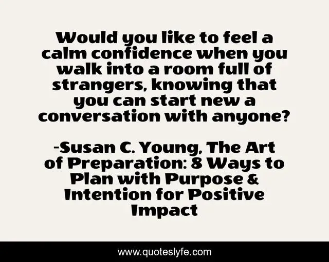 This page presents the quote "Would you like to feel a calm confidence when you walk into a room full of strangers, knowing that you can start new a conversation with anyone?". Author of this quote is Susan C. Young, The Art of Preparation: 8 Ways to Plan with Purpose & Intention for Positive Impact. This quote is about build-confidence, susan-young, relationship, communication-skills, attitude, behaviour, quotes-by-susan-c-young, preparation, mindset,.