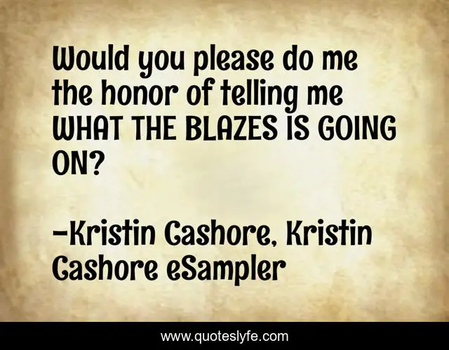 This page presents the quote "Would you please do me the honor of telling me WHAT THE BLAZES IS GOING ON?". Author of this quote is Kristin Cashore, Kristin Cashore eSampler. This quote is about raffin, katsa, nander, secret, council, letters, bann, po,.
