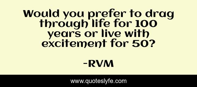 This page presents the quote "Would you prefer to drag through life for 100 years or live with excitement for 50?". Author of this quote is RVM. This quote is about motivation, inspiration,.
