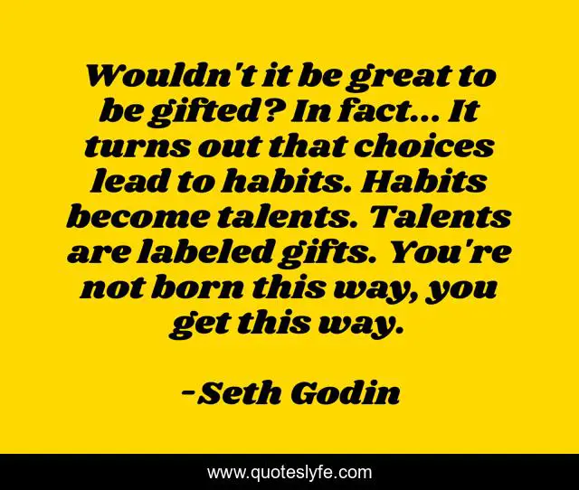 This page presents the quote "Wouldn't it be great to be gifted? In fact... It turns out that choices lead to habits. Habits become talents. Talents are labeled gifts. You're not born this way, you get this way.". Author of this quote is Seth Godin. This quote is about enthusiasm, talents, gifted, inspirational,.