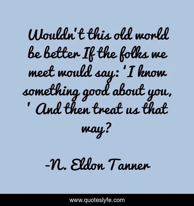 This page presents the quote "Wouldn’t this old world be better If the folks we meet would say: ‘I know something good about you, ’ And then treat us that way?". Author of this quote is N. Eldon Tanner. .