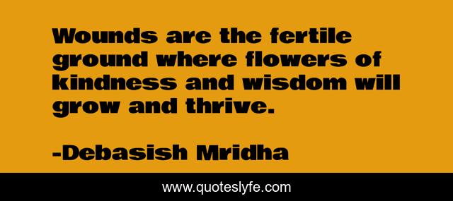 This page presents the quote "Wounds are the fertile ground where flowers of kindness and wisdom will grow and thrive.". Author of this quote is Debasish Mridha. This quote is about wounds-are-the-fertile-ground, flowers-of-kindness, inspirational, mridha, fertile-ground, debasish-mridha, wounds, wisdom, debasish,.