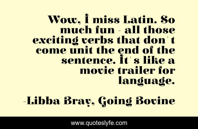 This page presents the quote "Wow, I miss Latin. So much fun - all those exciting verbs that don't come unit the end of the sentence. It's like a movie trailer for language.". Author of this quote is Libba Bray, Going Bovine. .