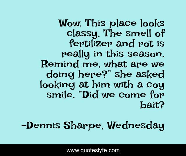 This page presents the quote "Wow. This place looks classy. The smell of fertilizer and rot is really in this season. Remind me, what are we doing here?” she asked looking at him with a coy smile. “Did we come for bait?". Author of this quote is Dennis Sharpe, Wednesday. This quote is about behaviour, comebacks, attitude, quotable, humor,.