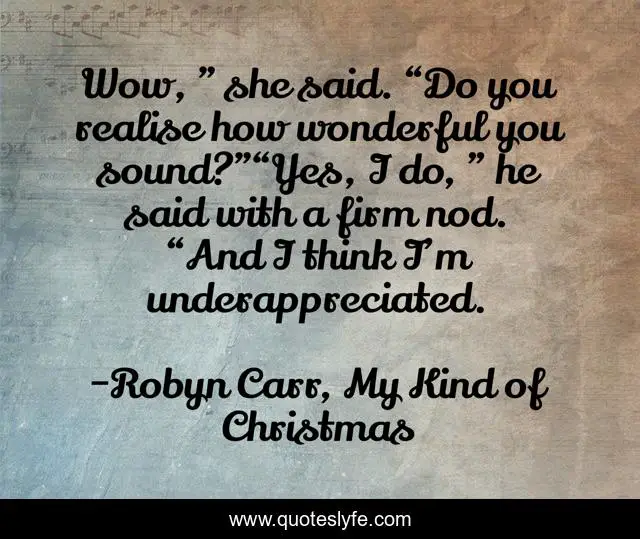 This page presents the quote "Wow, ” she said. “Do you realise how wonderful you sound?”“Yes, I do, ” he said with a firm nod. “And I think I’m underappreciated.". Author of this quote is Robyn Carr, My Kind of Christmas. This quote is about cute, romantic, humour, funny, romance, comedy, contemporary-romance,.