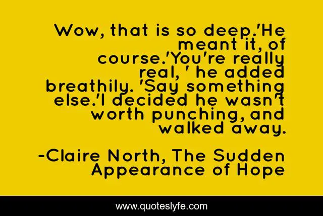 This page presents the quote "Wow, that is so deep.'He meant it, of course.'You're really real, ' he added breathily. 'Say something else.'I decided he wasn't worth punching, and walked away.". Author of this quote is Claire North, The Sudden Appearance of Hope. This quote is about deep-thoughts, compliments, humour,.