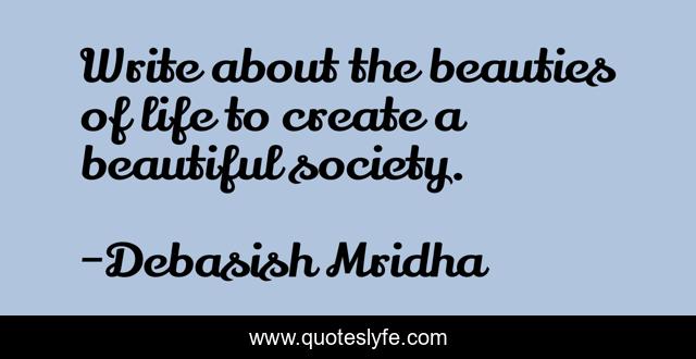 This page presents the quote "Write about the beauties of life to create a beautiful society.". Author of this quote is Debasish Mridha. This quote is about beautiful, life, debasish, beauty, mridha, philosophy, write, society,.