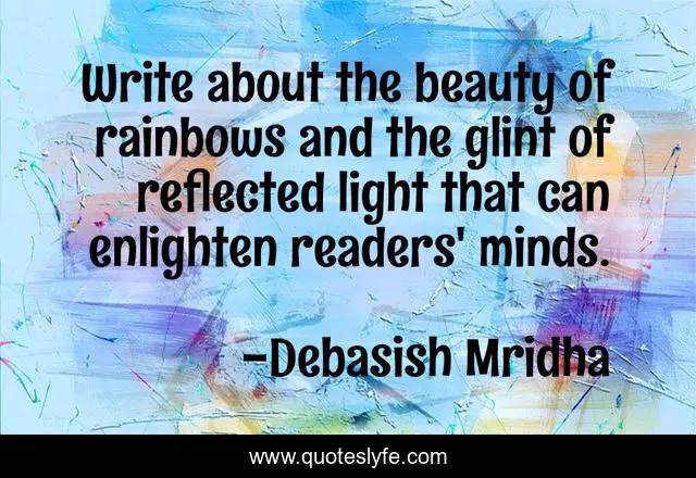 This page presents the quote "Write about the beauty of rainbows and the glint of reflected light that can enlighten readers' minds.". Author of this quote is Debasish Mridha. This quote is about rainbow, life, philosophy, beauty, light, debasish, mind, write, reader,.