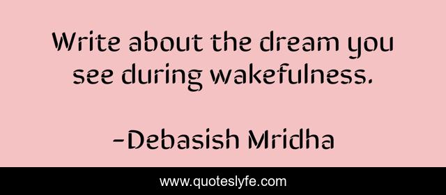 This page presents the quote "Write about the dream you see during wakefulness.". Author of this quote is Debasish Mridha. This quote is about life, debasish, mridha, philosophy, wakefulness, write, dream,.