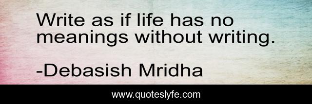 This page presents the quote "Write as if life has no meanings without writing.". Author of this quote is Debasish Mridha. This quote is about life, debasish, mridha, philosophy, write, meaning,.