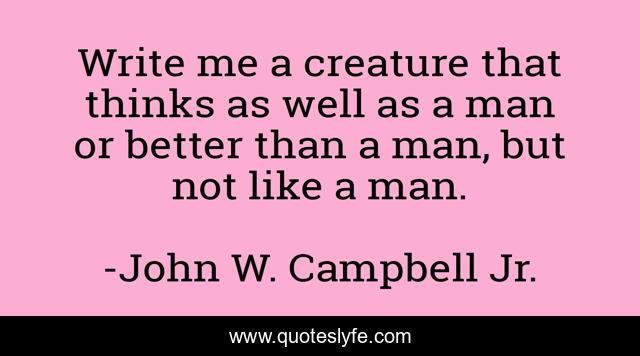 This page presents the quote "Write me a creature that thinks as well as a man or better than a man, but not like a man.". Author of this quote is John W. Campbell Jr.. This quote is about fantasy, horror, science-fiction,.