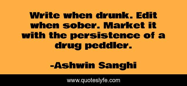 This page presents the quote "Write when drunk. Edit when sober. Market it with the persistence of a drug peddler.". Author of this quote is Ashwin Sanghi. This quote is about alcohol, marketing, paraphrasing-peter-de-vries, writing, books, editing,.