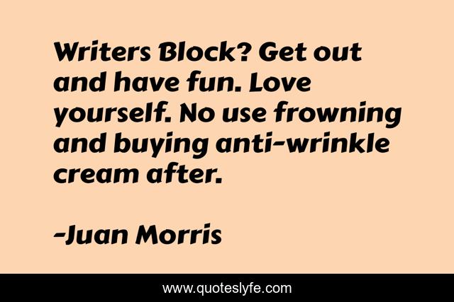 This page presents the quote "Writers Block? Get out and have fun. Love yourself. No use frowning and buying anti-wrinkle cream after.". Author of this quote is Juan Morris. .