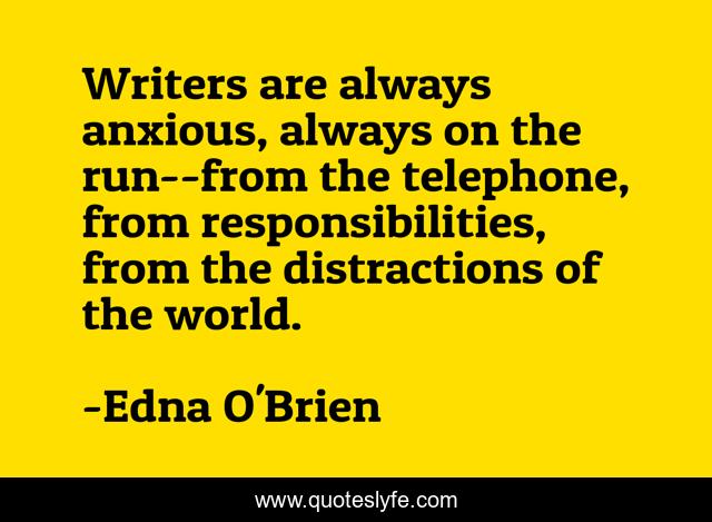 This page presents the quote "Writers are always anxious, always on the run--from the telephone, from responsibilities, from the distractions of the world.". Author of this quote is Edna O'Brien. .