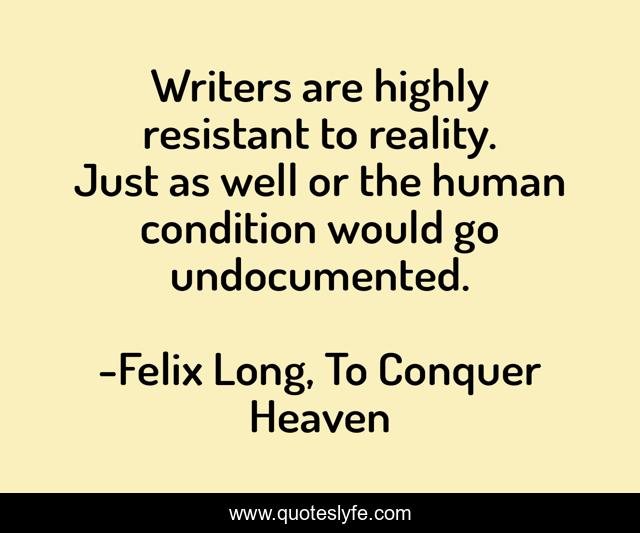 "Felix Long, To Conquer Heaven Quotes." Quoteslyfe.com, 2025. Fri. 05 Dec. 2025. <https://www.quoteslyfe.com/quote/Writers-are-highly-resistant-to-reality-Just-20182>.