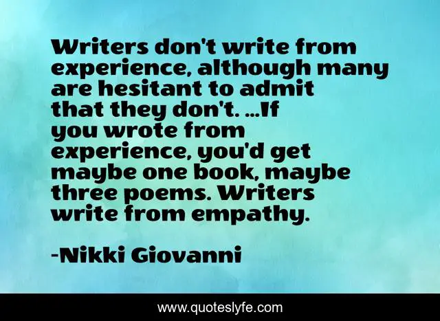 This page presents the quote "Writers don't write from experience, although many are hesitant to admit that they don't. ...If you wrote from experience, you'd get maybe one book, maybe three poems. Writers write from empathy.". Author of this quote is Nikki Giovanni. .