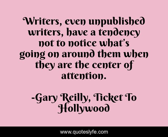 This page presents the quote "Writers, even unpublished writers, have a tendency not to notice what’s going on around them when they are the center of attention.". Author of this quote is Gary Reilly, Ticket To Hollywood. .