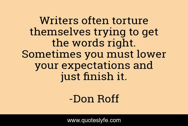 This page presents the quote "Writers often torture themselves trying to get the words right. Sometimes you must lower your expectations and just finish it.". Author of this quote is Don Roff. This quote is about tips-on-writing, torture, writing-advice, writing-process, expectations, writing, writers, words, revising,.