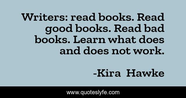 This page presents the quote "Writers: read books. Read good books. Read bad books. Learn what does and does not work.". Author of this quote is Kira Hawke. This quote is about books, reading, writing,.
