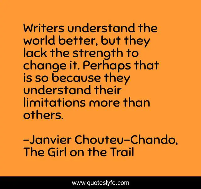 This page presents the quote "Writers understand the world better, but they lack the strength to change it. Perhaps that is so because they understand their limitations more than others.". Author of this quote is Janvier Chouteu-Chando, The Girl on the Trail. This quote is about love, family, optimistic, confidence, humor, positive, romance, spirituality, enthusiasm,.