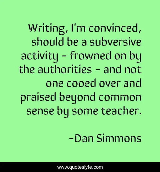 This page presents the quote "Writing, I'm convinced, should be a subversive activity - frowned on by the authorities - and not one cooed over and praised beyond common sense by some teacher.". Author of this quote is Dan Simmons. This quote is about common sense, writing,.