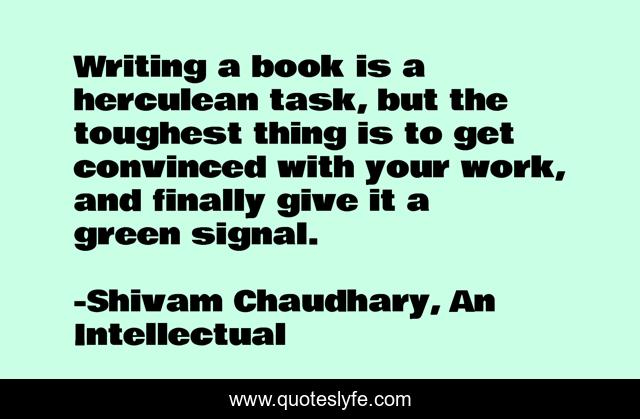 This page presents the quote "Writing a book is a herculean task, but the toughest thing is to get convinced with your work, and finally give it a green signal.". Author of this quote is Shivam Chaudhary, An Intellectual. This quote is about life, philosophy,.