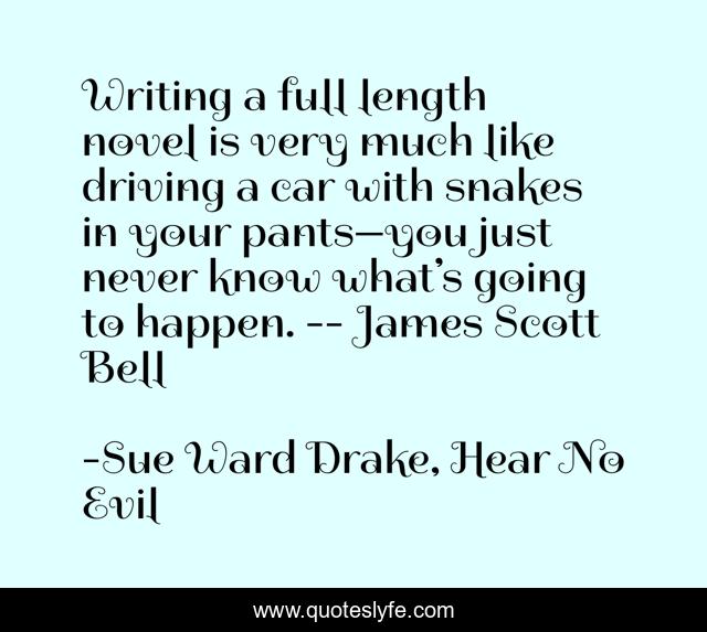 This page presents the quote "Writing a full length novel is very much like driving a car with snakes in your pants—you just never know what’s going to happen. -- James Scott Bell". Author of this quote is Sue Ward Drake, Hear No Evil. .