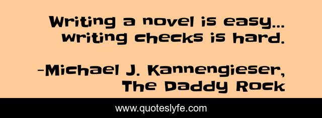 This page presents the quote "Writing a novel is easy… writing checks is hard.". Author of this quote is Michael J. Kannengieser, The Daddy Rock. This quote is about novel, checks, writing,.
