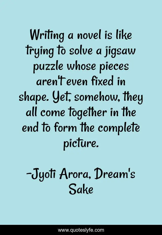 This page presents the quote "Writing a novel is like trying to solve a jigsaw puzzle whose pieces aren't even fixed in shape. Yet, somehow, they all come together in the end to form the complete picture.". Author of this quote is Jyoti Arora, Dream's Sake. This quote is about puzzle, novel, writing,.