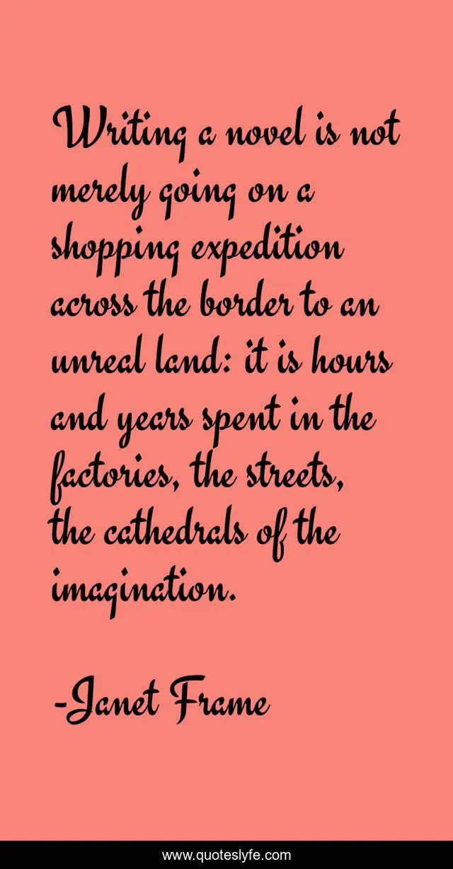 This page presents the quote "Writing a novel is not merely going on a shopping expedition across the border to an unreal land: it is hours and years spent in the factories, the streets, the cathedrals of the imagination.". Author of this quote is Janet Frame. This quote is about imagination, writing, novel, inspirational, enthusiasm,.