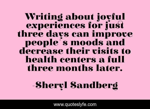 This page presents the quote "Writing about joyful experiences for just three days can improve people's moods and decrease their visits to health centers a full three months later.". Author of this quote is Sheryl Sandberg. This quote is about writing, three, people,.