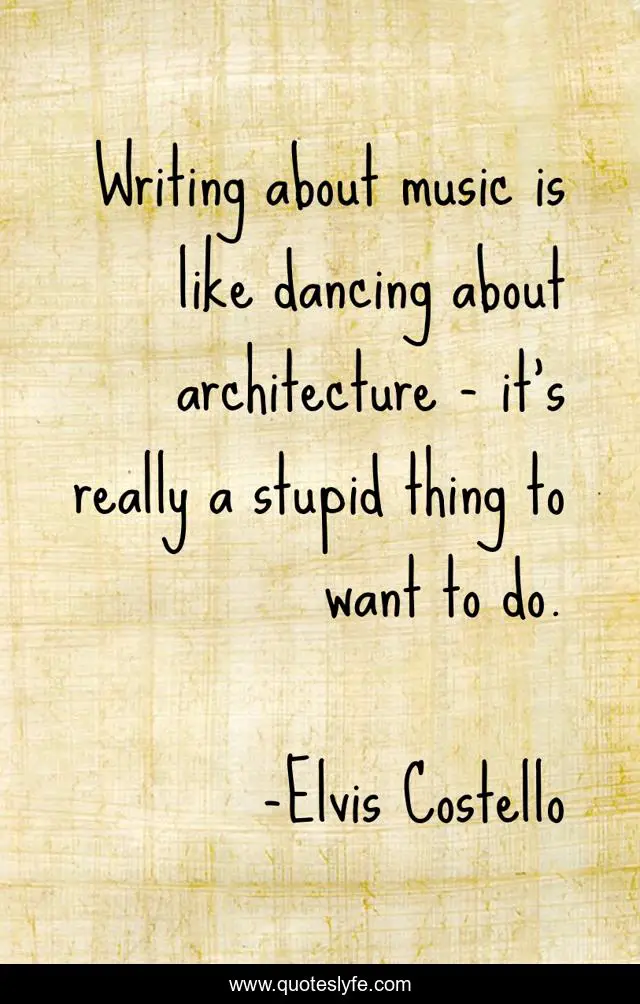 This page presents the quote "Writing about music is like dancing about architecture - it's really a stupid thing to want to do.". Author of this quote is Elvis Costello. This quote is about music, writing,.