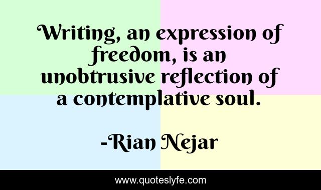 This page presents the quote "Writing, an expression of freedom, is an unobtrusive reflection of a contemplative soul.". Author of this quote is Rian Nejar. This quote is about freedom, reflection, soul, writing,.