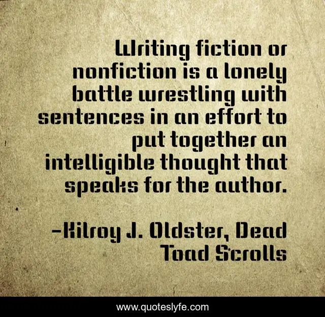 This page presents the quote "Writing fiction or nonfiction is a lonely battle wrestling with sentences in an effort to put together an intelligible thought that speaks for the author.". Author of this quote is Kilroy J. Oldster, Dead Toad Scrolls. This quote is about writers-on-writing, writers, writing,.